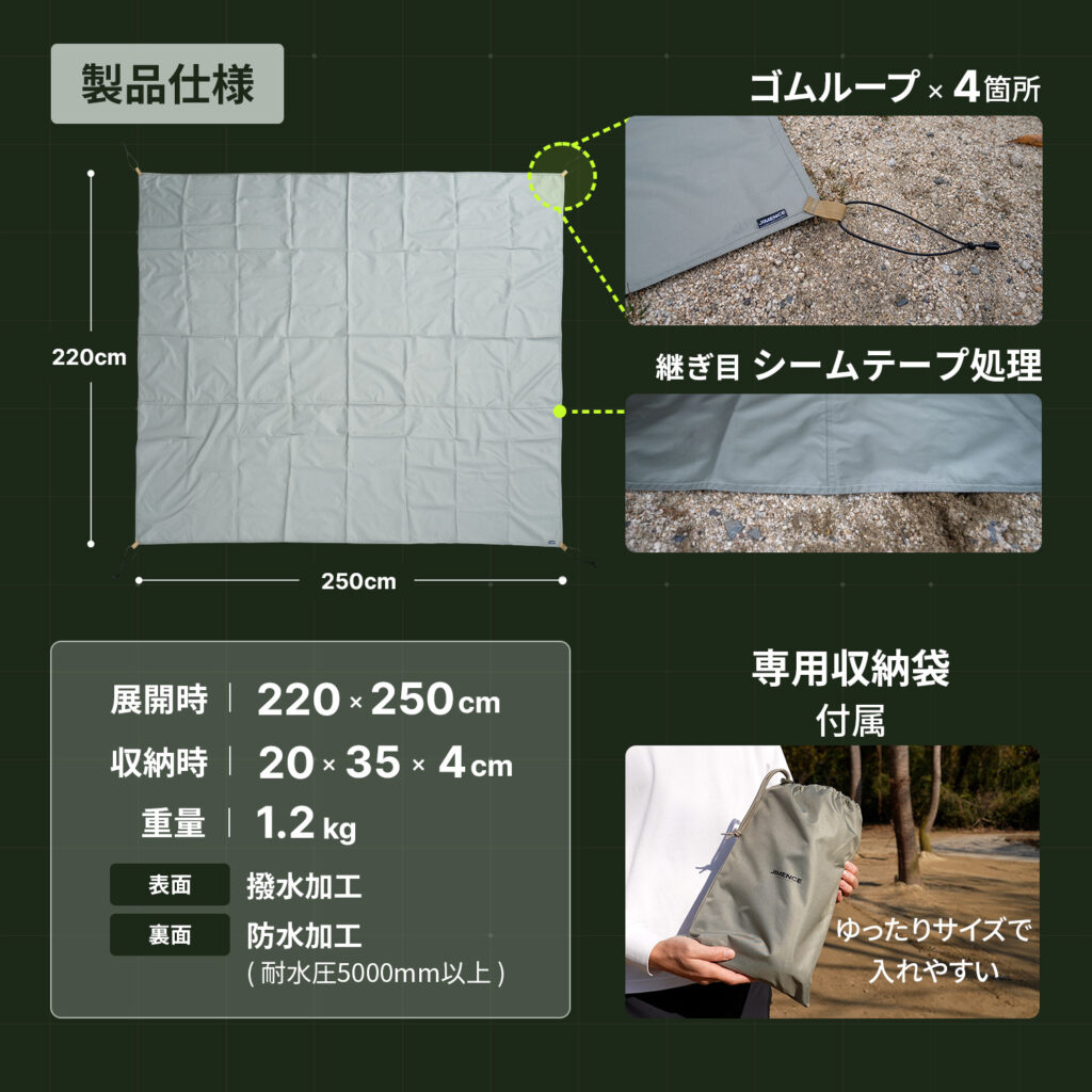 そんな悩みを持つ方にぜひ知ってほしいのが、JIMENCEの 300D グランドシート(220×250cm)です。