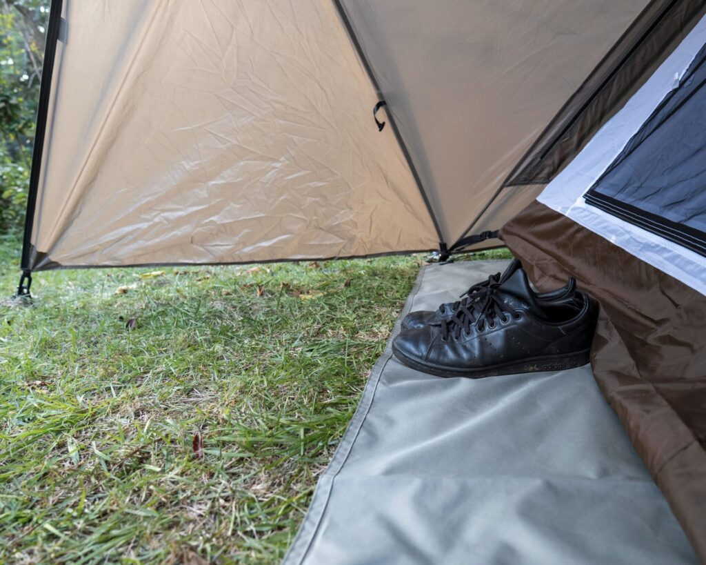 - 自然に溶け込む「名脇役」: キャンプ場の芝生や砂、雑草が混じった地面において、このライトカーキは周囲の風景にスッと馴染みます。コントラストの薄い色なので目立たないのです。テントのデザインを邪魔せず、足元を上品に引き立ててくれますよ。