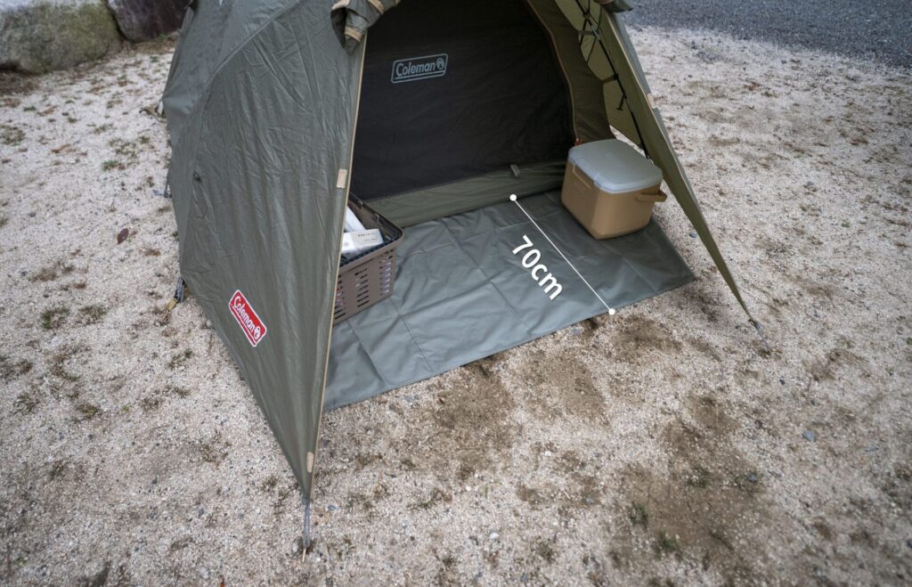 snowpeak ランドネストドーム Sくらいの2-3人用テントなら、横向きにすればちょうど良いです。前室にも少しはみ出ますよ。
