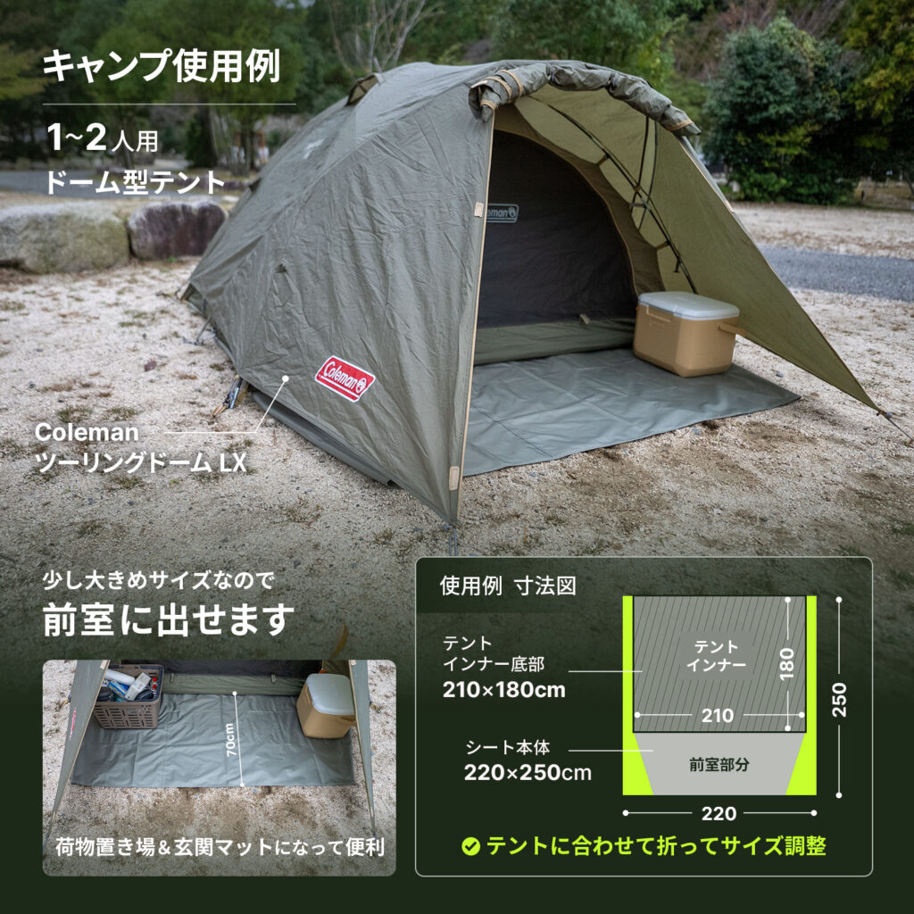 ・コールマン ツーリングドームLX インナーテント(210×180cm)に対してシートの方が少し大きいため、はみ出した部分を前室側に広げるのがおすすめです。荷物置き場や、靴の脱ぎ履きをするスペースとしてとても便利に活用できます。