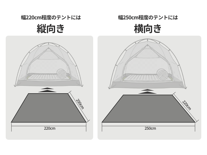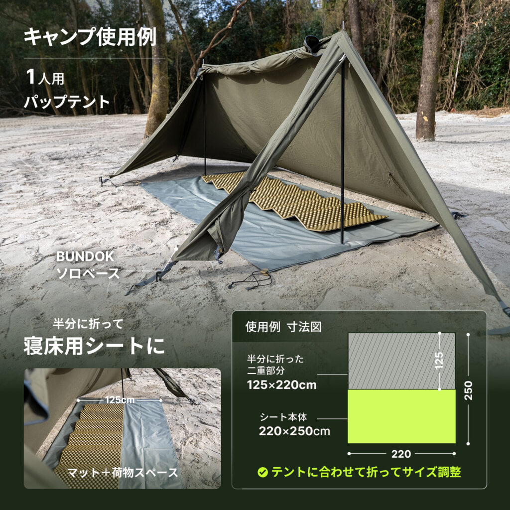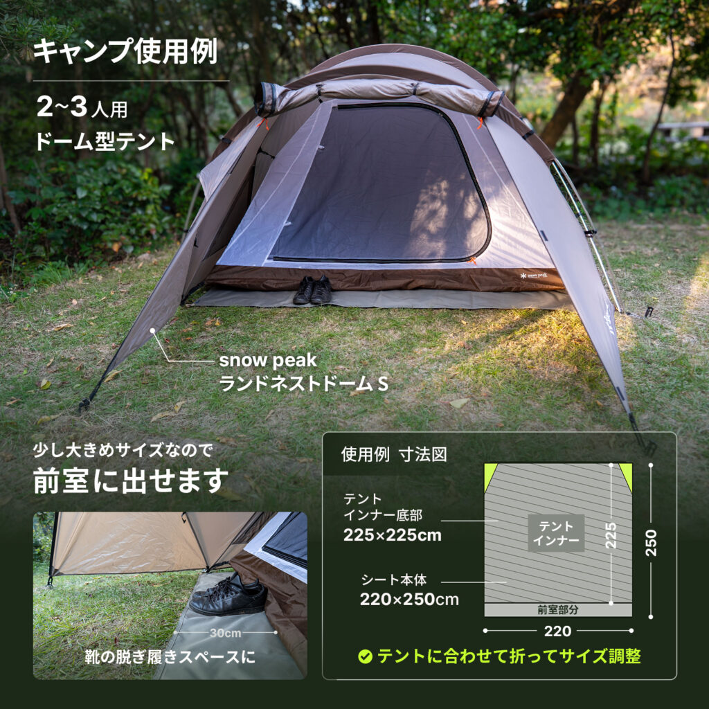サイズは「220×250cm」の長方形です。あえて正方形にしないことで、テントの幅や奥行きに合わせて縦向き・横向きを変え、折り込んで微調整しやすくしています。