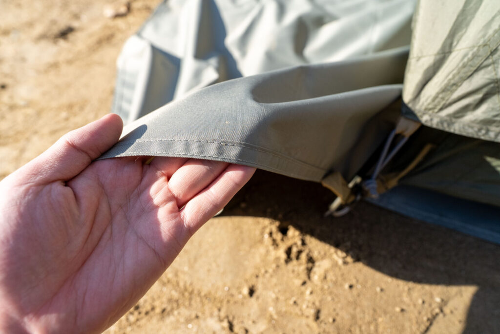 裏面には耐水圧5000mm以上の強力なPUコーティングを施し、生地の継ぎ目にはシームテープ処理を行っています。動画内で行った簡易耐水圧試験でも水漏れはなく、雨の日のキャンプでも地面からの水分をしっかりシャットアウトします。
