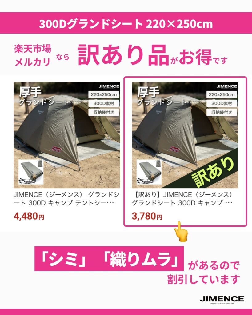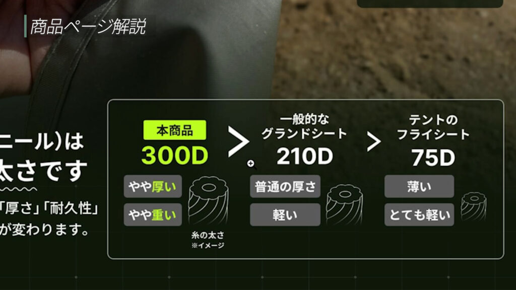 テントの底を汚れや傷から守るグランドシートですが、JIMENCEのシートは「300D(デニール)」という厚めの生地を採用しています。