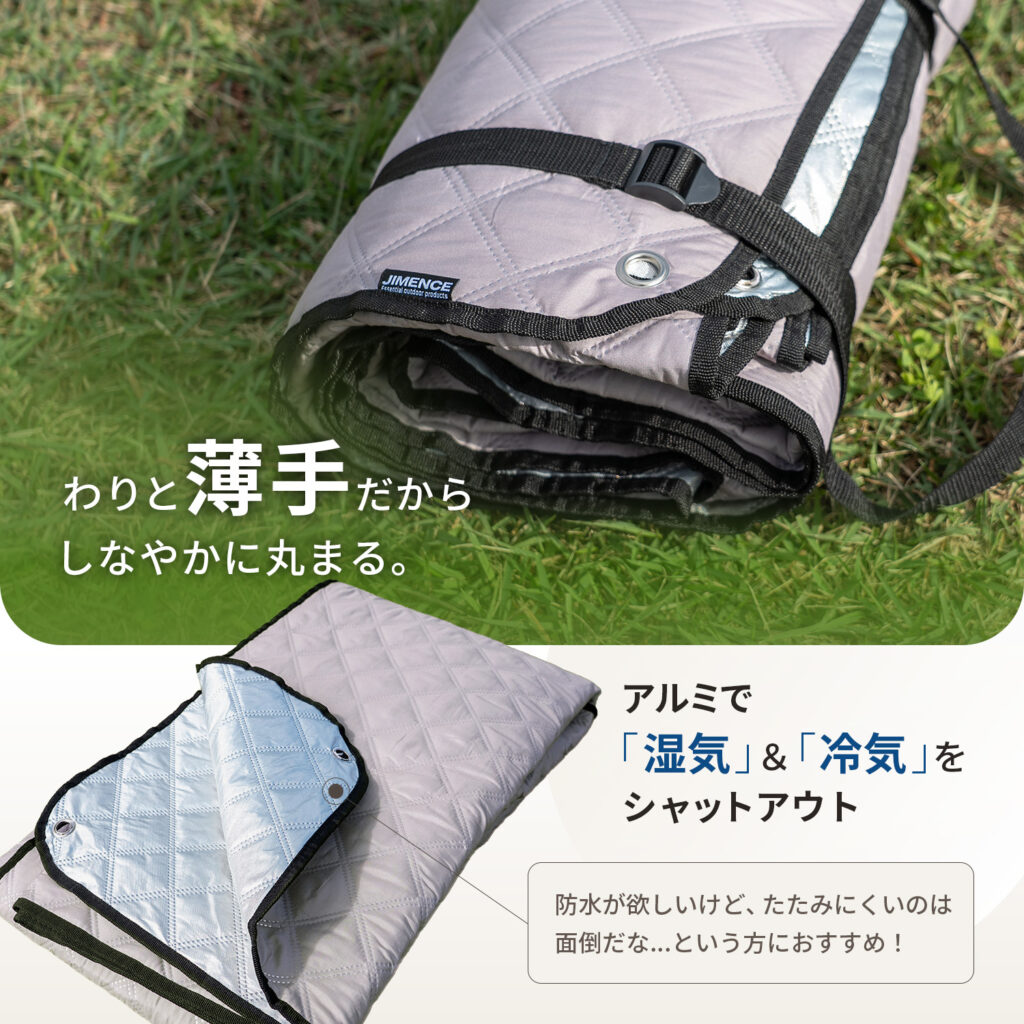 そこでJIMENCEは裏面にアルミフィルムをいれて防水仕様に。そして中綿を詰めてクッション性を確保しました。裏面が銀色なので高級感はあまりありませんが、確実に防水できるのが特徴です。また、冬場には多少の保温効果も見込めます。