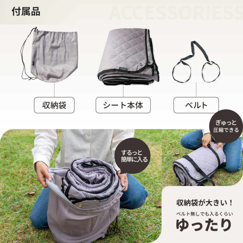 - 内容物:レジャーシート本体、収納袋、ベルト