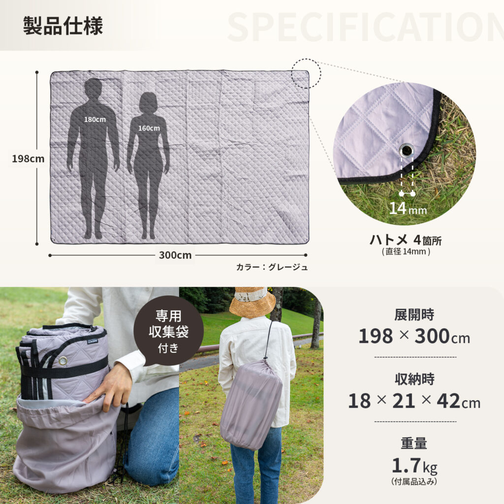 - サイズ:198×300cm(収納時:直径18×21×42cm)